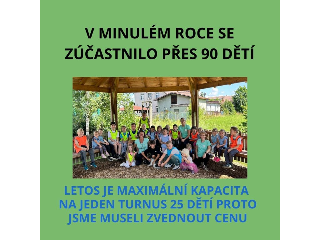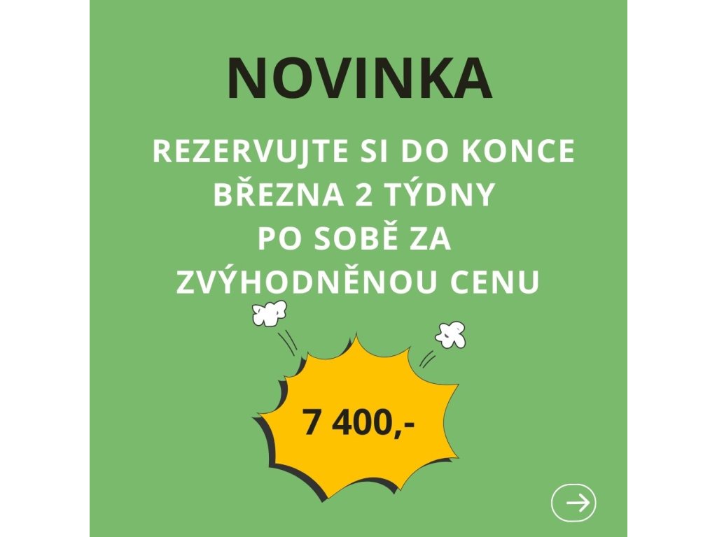 V případě zaplacení do konce března platí zvýhodněná cena 3950 Kč, pokud si vyberete možnost 2 turnusy vložte si do košíku prosím oba turnusy , odešlete objednávku a my vám cenu poté upravíme aby odpovídala 2 turnusům za 7400,- děkujeme