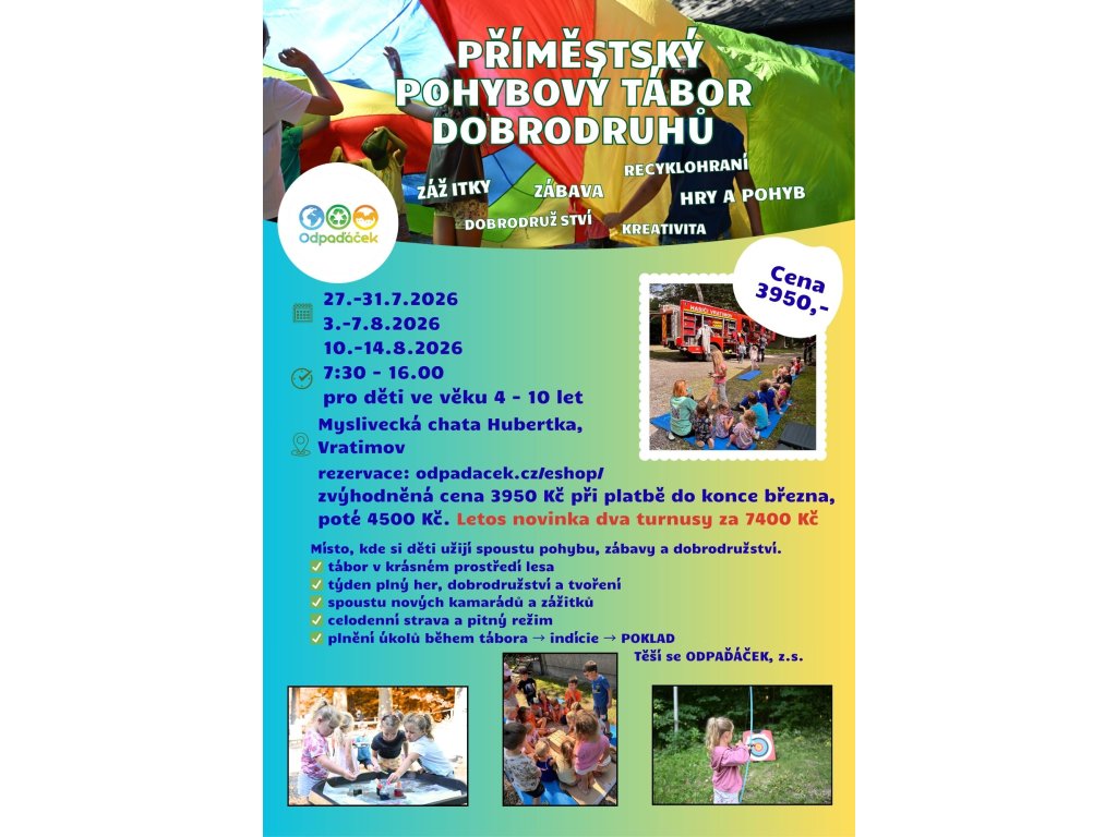 Pojišťovny přispívají na tábor částkou od 500 Kč na dítě, RBP dokonce až 1500 Kč! 🎉 Stačí s sebou přinést předvyplněné potvrzení od vaší pojišťovny – my vám ho orazítkujeme. Faktura vám dorazí automaticky po zaplacení.
