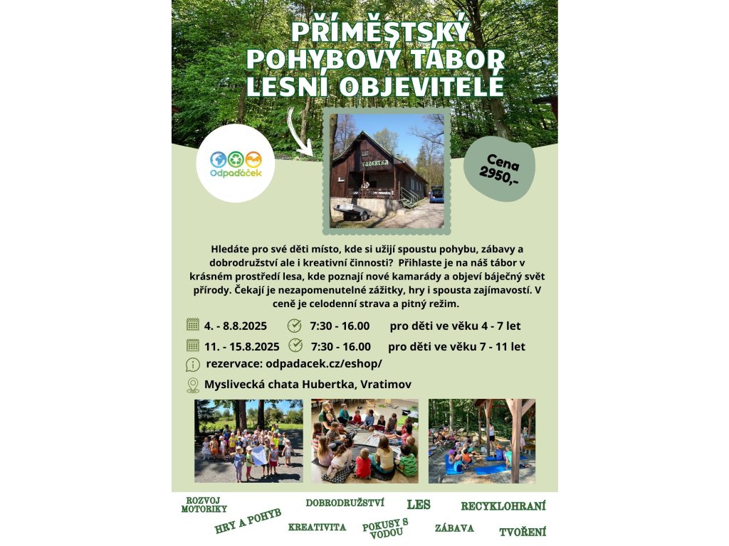 Příměstský atleticky pohybový tábor Lesní objevitelé na chatě Hubertka Vratimov 4 - 8.8.2025, VĚK 4 - 7 LET